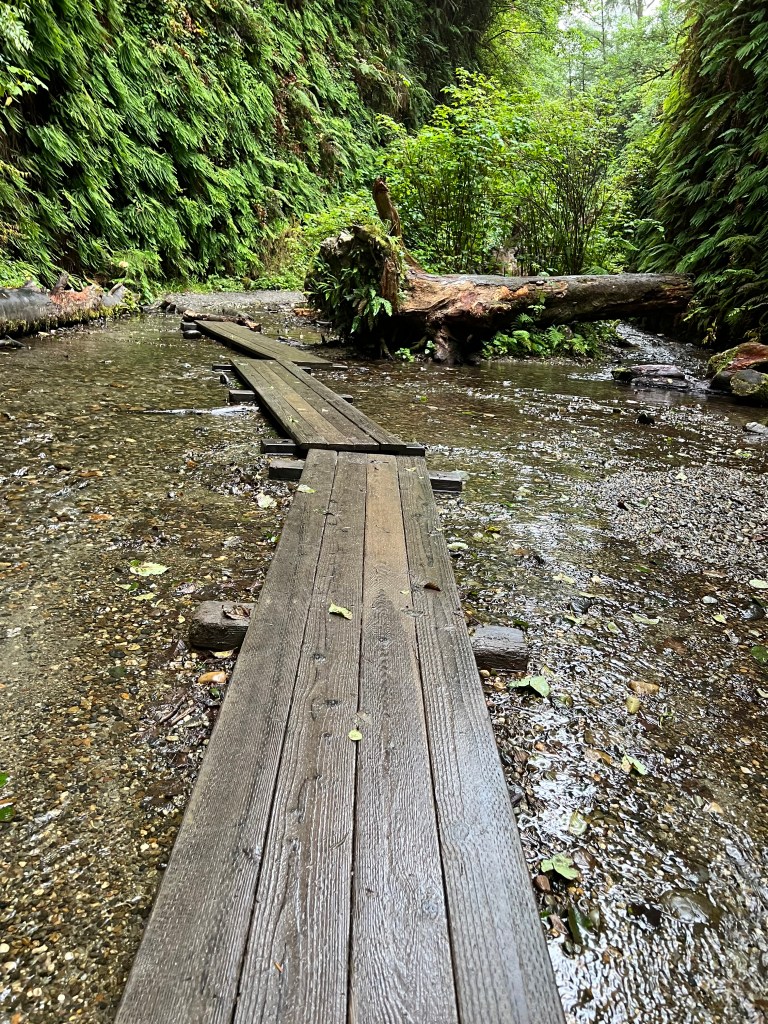 Fern Canyon in Prairie Creek Redwoods, access Fern Canyon via Davison Rd. Permitted (get a permit in advance). Bring ID to match permit (nobody checked ours) and $12 cash for the parking fee. Bring water shoes and pants you can role up.